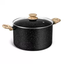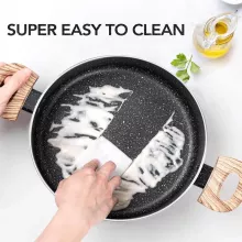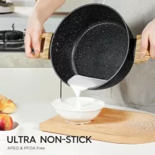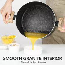 Crafted from high-quality pressed aluminum, it features a durable 3-layer black marble nonstick coating inside, allowing for smooth food release and effortless cleanup. The elegant exterior, finished in matte black with subtle white speckles, adds a modern touch to your cookware collection. Paired with a soft-touch bakelite handle that mimics natural wood, it ensures comfort and safety while handling hot meals.