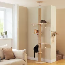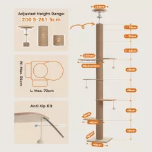 Transform your home into a feline paradise with the Adjustable Floor to Ceiling Cat Tree — a sleek, space-saving tower designed to keep indoor cats active, happy, and safe. Built from sturdy wood with natural sisal-wrapped posts, this modern cat tower offers endless opportunities for climbing, scratching, and lounging while blending effortlessly into your décor. Its adjustable height from 79″ to 103″ means it fits perfectly between your floor and ceiling without drilling, making it ideal for any room or apartment.